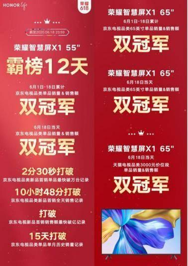 荣耀智慧屏X165英寸也是6月1日~18日累计京东电视品类65英寸单品销量&销售额双冠军,并在6月18日当天拿下京东电视品类65英寸单品销量&销售额双冠军、天猫电视品类3000元价位段单品销量&销售额双冠军。