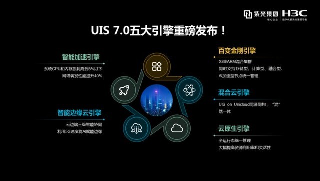 对此,紫光股份旗下新华三集团给出了答案。在上个月的可信云大会上,新华三推出面向未来企业数据中心的下一代超融合创新架构UIS7.0,打造业界首款中心边缘统一架构的超融合平台,也是首款实现前后端整体加速、首款融合云原生能力的超融合。在智能加速引擎、百变金刚引擎、混合云引擎、云原生引擎、智能边缘云引擎五大核心引擎辅助下,将ABC(AI, Big Data, Cloud)能力赋予边缘,为各行各业的企业级用户带来极致融合、极简规模、极宽场景、极优交付的全新体验。