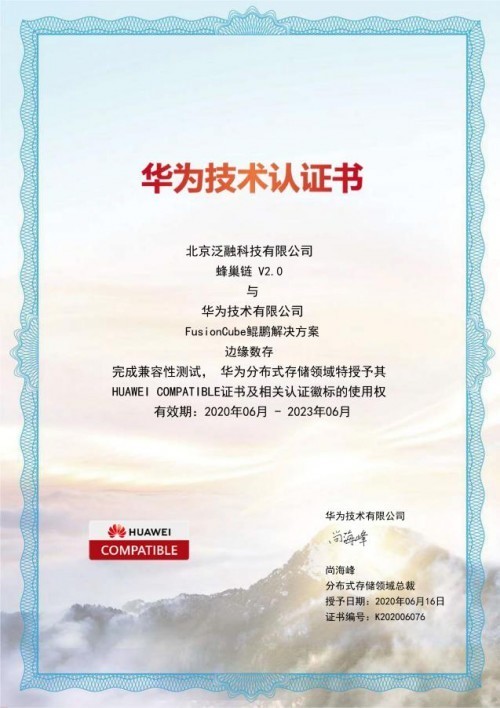 此前,泛融科技自主研发的“蜂巢链”已经获得华为技术认证,与华为 TaiShan 服务器完成兼容性测试。在华为TaiShan系列服务器上,泛融科技的自有核心区块链产品“蜂巢链”能够满足兼容性、流畅度、安全性、可靠性等诸多条件,为泛融科技基于“蜂巢链”技术打造的可信存储系统在华为TaiShan系列服务器运行提供了基础保障。