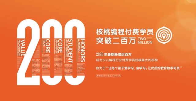 近日,少儿编程教育机构核桃编程对外披露最新业绩。数据显示,截至2020年8月,核桃编程付费学员突破200万人,同比增长超过200%,其中今年暑期新增付费学员近100万人,继续稳固了其付费学员规模最大的少儿编程教育机构地位。同时,核桃编程宣布已实现首单盈利,成为少儿编程行业首家首单盈利企业。