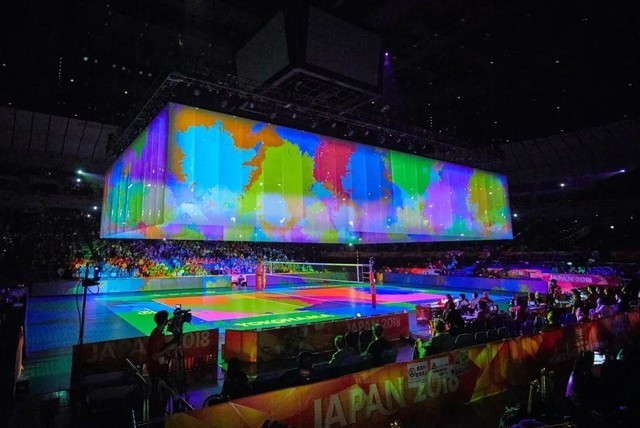 在2018世界女排大奖赛开幕式会场上,“引能仕佳丽得透明投影膜”组成了巨大透明显示屏,将体育文化与时尚科技完美融合,打造一场绚丽的视觉盛宴。